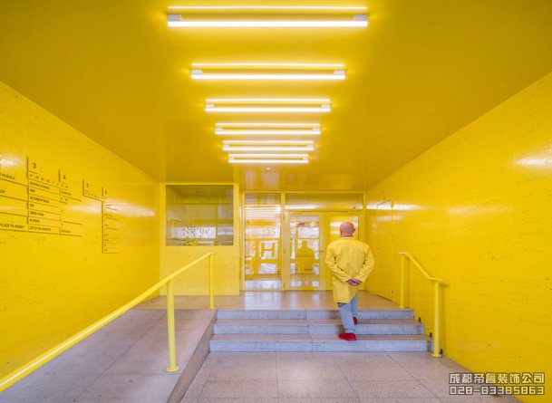 將過道的頂面墻面全部涂成黃色,給人帶來另一種視覺效果。醒目的黃色使得空間更加跳躍,具有引導作用。頂面簡單的LED燈具很好的為空間提供照明,也不會給人繁雜的感覺。