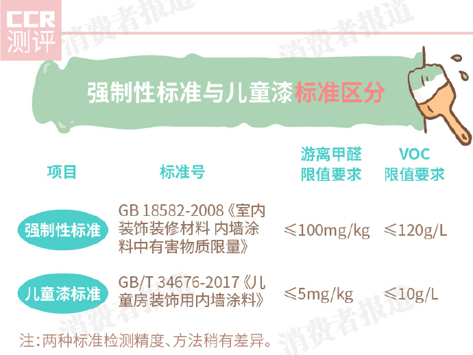 目前各個品牌包裝上執行的仍是18582-2008《室內裝飾裝修材料內墻涂料中有害物質限量》或普通乳膠漆的推薦性標準GB/T 96-2009《合成樹脂乳液內墻涂料》。外包裝上印有兒童漆推薦性國標GB/T 34676-2017 《兒童房裝飾用內墻涂料》的只有紫荊花。
